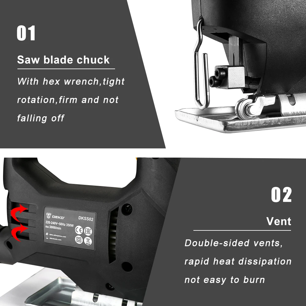 Addition Information of DEKO 350W Jig Saw Convenient Continuous Mode Electric Saw with 1pc Blade Allen Wrench 2pcs Carbon B